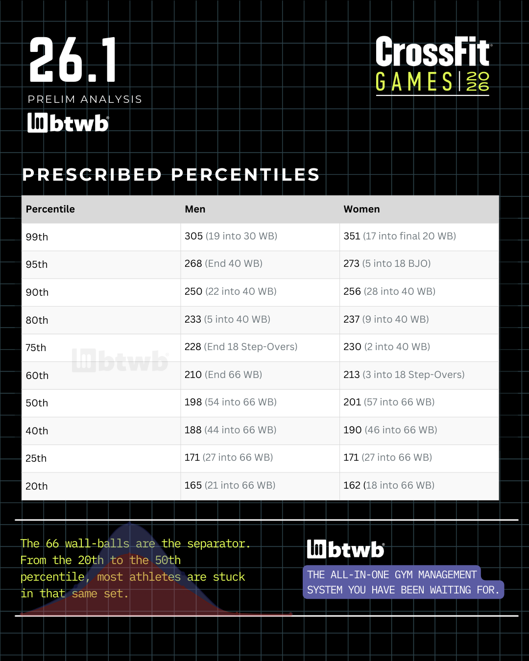 O exercício teve um efeito de gargalo, especialmente para os homens, onde o limite de tempo impediu que uma grande parte do pelotão avançasse para os últimos segmentos de wall-ball. Poucos atletas conseguiram chegar tão longe, o que ressalta a dificuldade do workout.